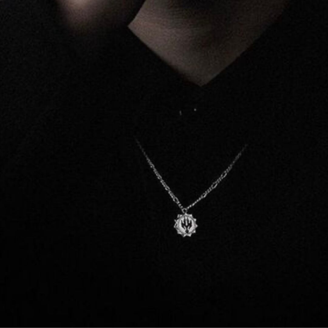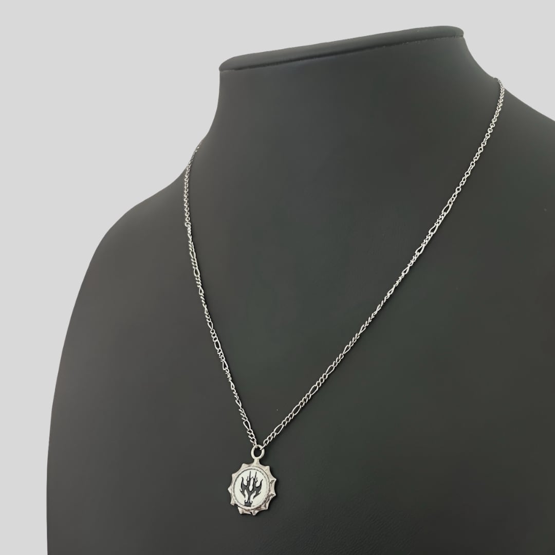 炎モチーフを刻んだコインデザインが、首元に強い存在感をプラス。